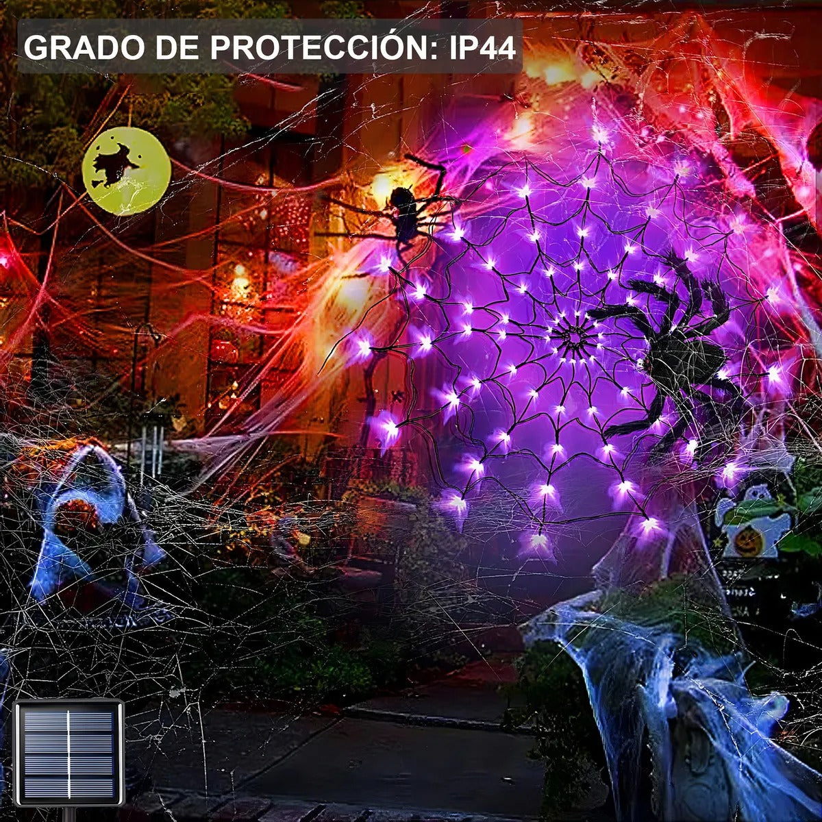 La Luz de Telaraña con Araña Violeta crea una atmósfera terrorífica y divertida. Ideal para decorar tu casa, jardín o fiestas nocturnas sin preocuparte por cables.